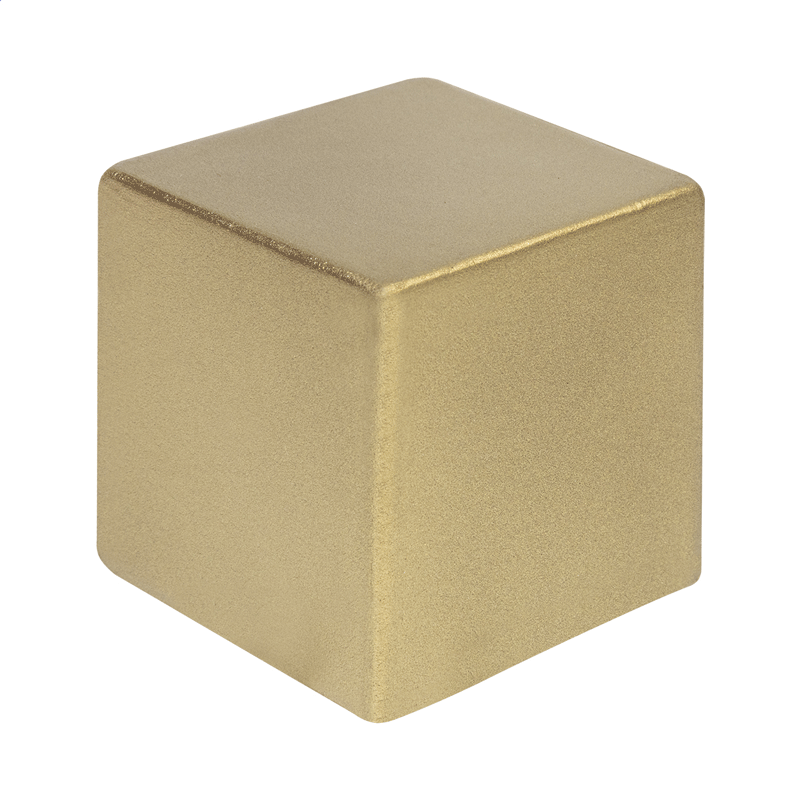 Antystres w kształcie sześcianu wykonany z pianki PU z metalicznym wykończeniem.