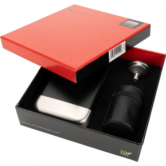 Zestaw Schwarzwolf hip flask set. Zawiera: piersiówkę o pojemności 266 ml w czarno-srebrnej kombinacji ze stali nierdzewnej, kieliszki 30 ml w czarnym woreczku i lejek. Na spodzie ścianki umieszczono logo Schwarzwolf.