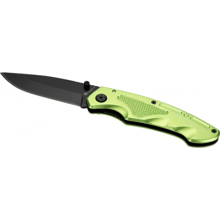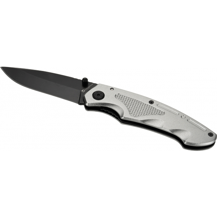 Nóż kieszonkowy wykonany ze stali nierdzewnej z aluminiową rękojeścią i klipsem do mocowania na pasku.