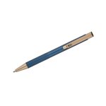 Elegancki aluminiowy długopis. Wykończenia w kolorze złotym. Wkład półżelowy w kolorze niebieskim.