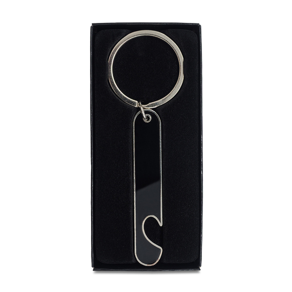Brelok o czarnej błyszczącej powierzchni, z funkcją otwieracza. Pakowany w czarne pudełko upominkowe.