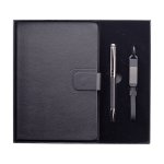 Zestaw upominkowy w eleganckim czarnym pudełku zawierający notes A5, długopis, oraz brelok/kabel USB 2w1. Notes w twardej oprawie z wykończeniem z eko skóry, zamykany na magnes, 96 stron w kratkę 4mm z miejscem na datę (papier 100 g/m²). Długopis z niebieskim wkładem, również wykończony eko skórą. W zestawie znajduje się także brelok/kabel USB 2w1 (USB-C do USB-C oraz USB do USB-C), wykonany z aluminium. Obsługuje szybkie ładowanie (PD 27W, 2.4A) oraz transmisję danych.
