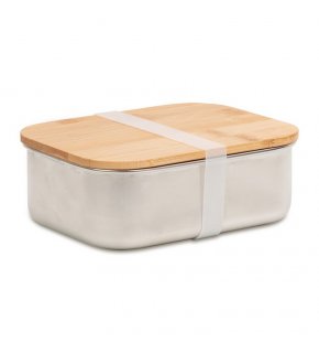Stalowy pojemnik na lunch z pokrywką z bambusa.