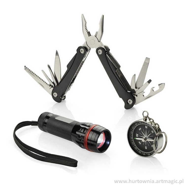Zestaw upominkowy zawierający latarkę, narzędzie wielofunkcyjne oraz kompas. Latarka posiada bardzo jasną diodę, możliwość regulacji wiązki światła oraz 3 tryby świecenia: mocny, słaby oraz migający. Każdy element jest wykonany z metalu a całość zapakowana w eleganckie czarne pudełko.
