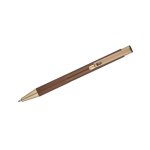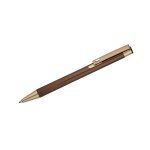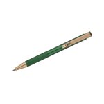 Elegancki aluminiowy długopis. Wykończenia w kolorze złotym. Wkład półżelowy w kolorze niebieskim.