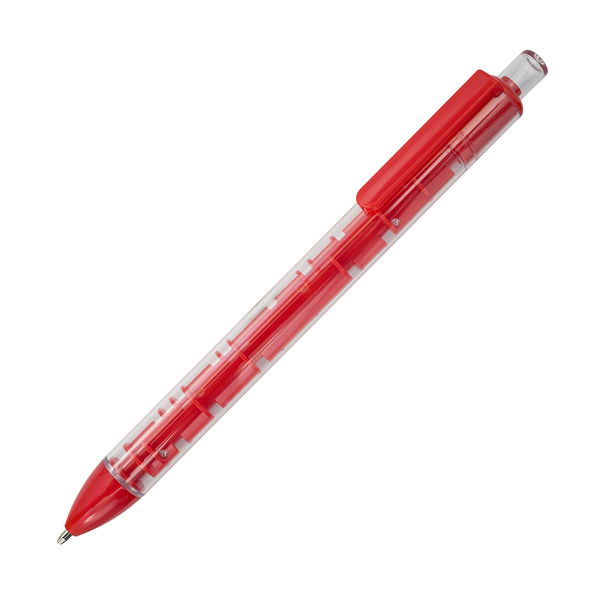 Oryginalny długopis z przezroczystym korpusem i wbudowanym labiryntem. Wkład w kolorze niebieskim.