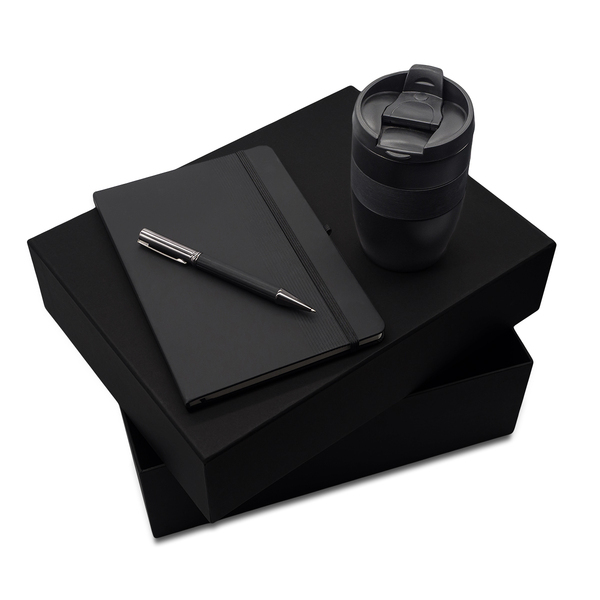 Zestaw upominkowy zawierający notes A5, 80-kartkowy w kratkę 4mm (papier 70 g/m²) w twardej oprawie PU, metalowy długopis, w dopasowanym wykończeniu (wkład w kolorze niebieskim) oraz próżniowy kubek z podwójnymi ściankami ze stali nierdzewnej 18/8 wewnątrz i silikonową opaską. Pojemność 300 ml. Utrzymuje temperaturę powyżej 40°C do 5 godzin.